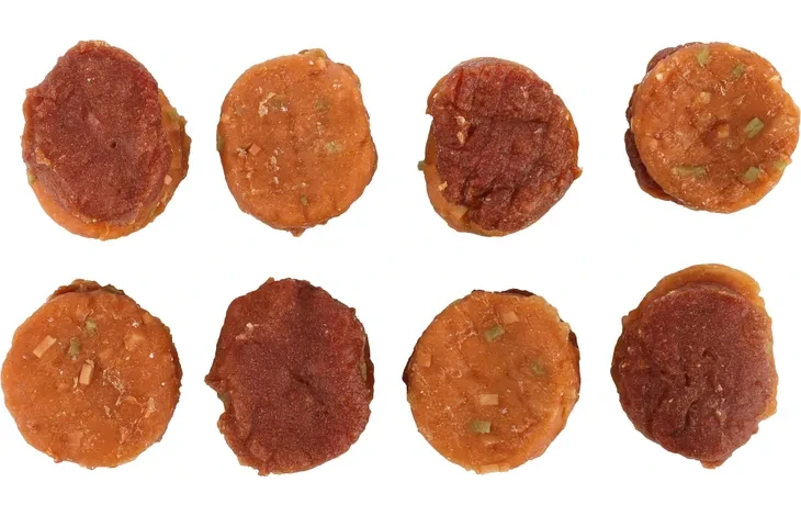 Zusammensetzung: Ente 60%, Huhn 23%, Glycerin, Stärke, pflanzliches Protein, Weizenmehl, Trehalose, Erbsenballaststoffe, Sorbitol, Pflanzenöl, Kohlpulver, Karottenpulver, Karamell. Zusatzstoffe: sensorische